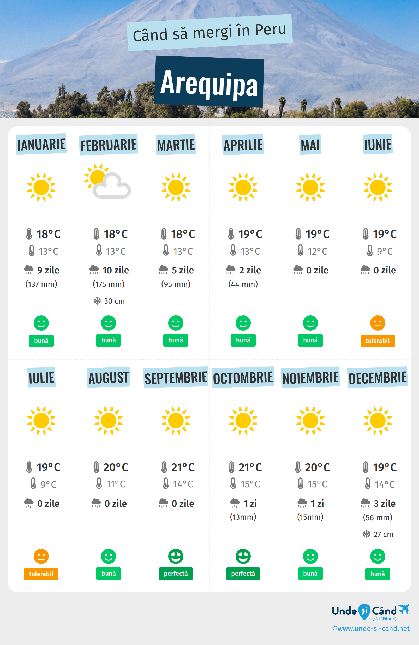 - Cele mai bune luni pentru vreme bună în Arequipa sunt Ianuarie, Februarie, Martie, Aprilie, Mai, August, Septembrie, Octombrie, Noiembrie și Decembrie